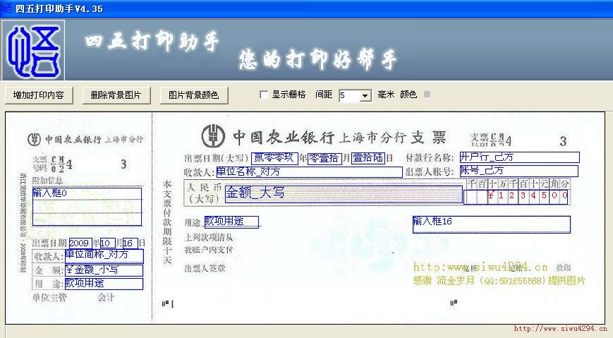 软件内置EMS、农行支票、工行业务委托书三个模板,其他模板,可以在本站下载后在软件设计器内导入使用。